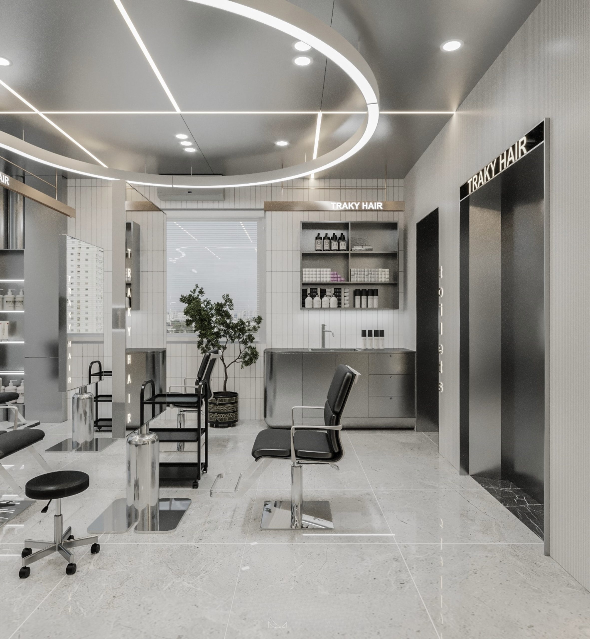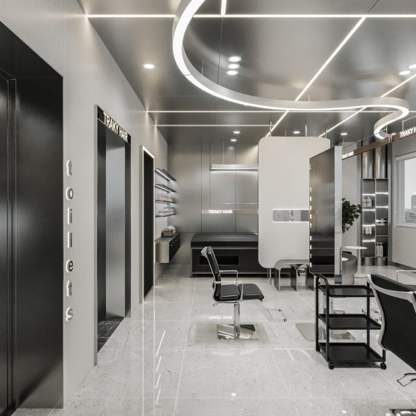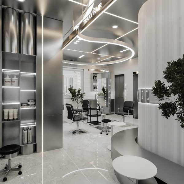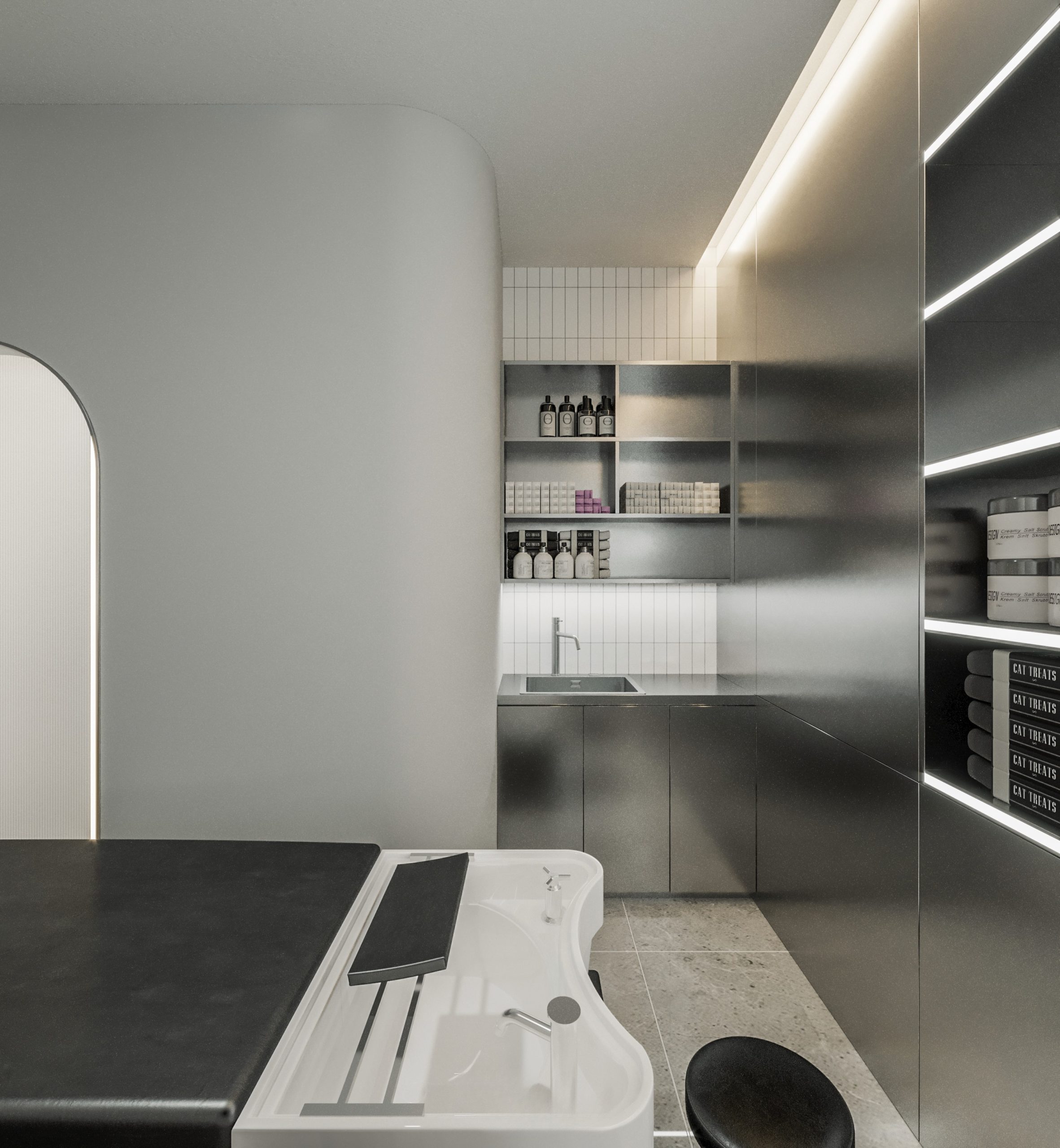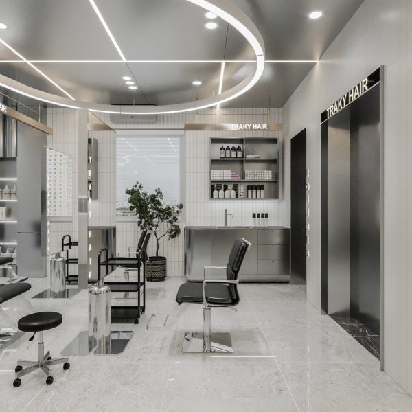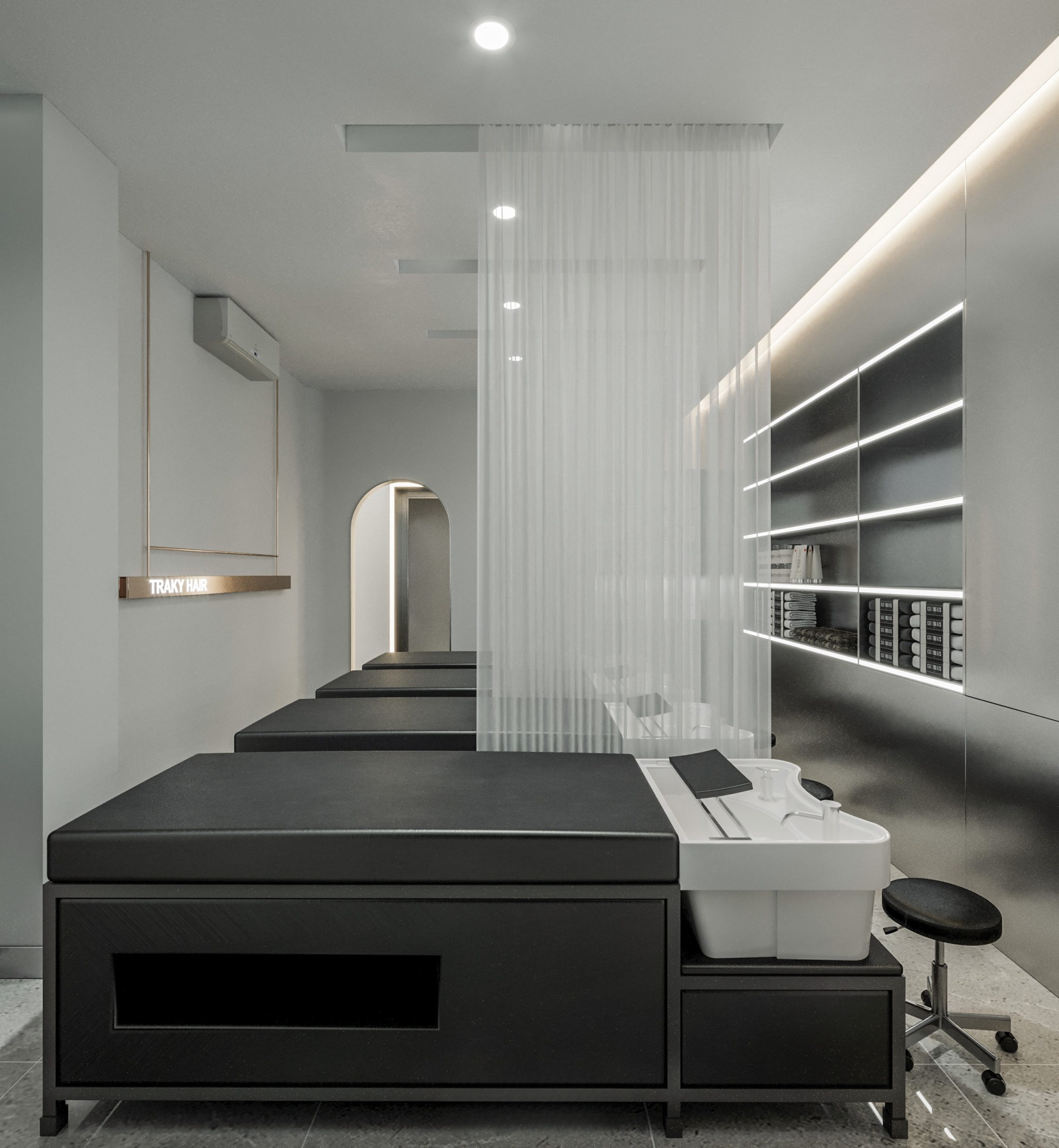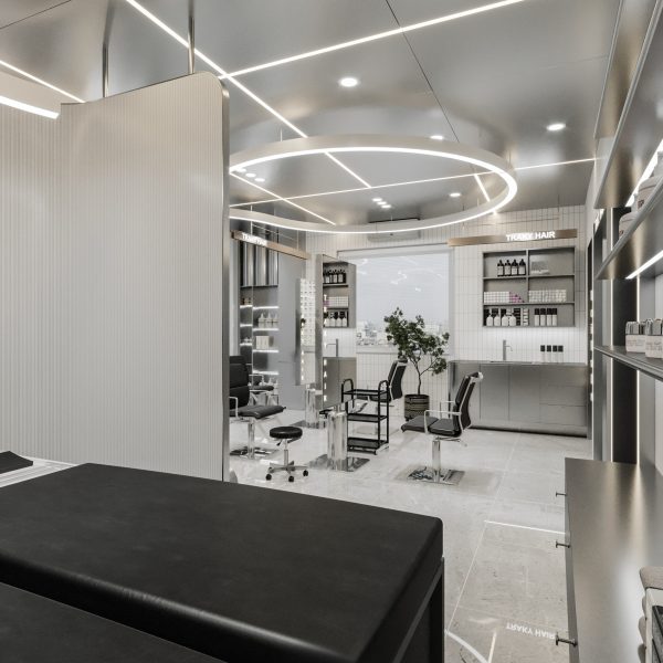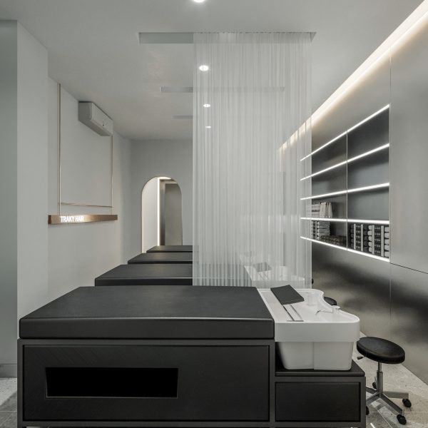 “A space built upon delicate balance, where light and shadow converge to embrace a gentle warmth. The hair zone, the lounge, and the display elements flow seamlessly together, creating a stage for both sight and sensation.”