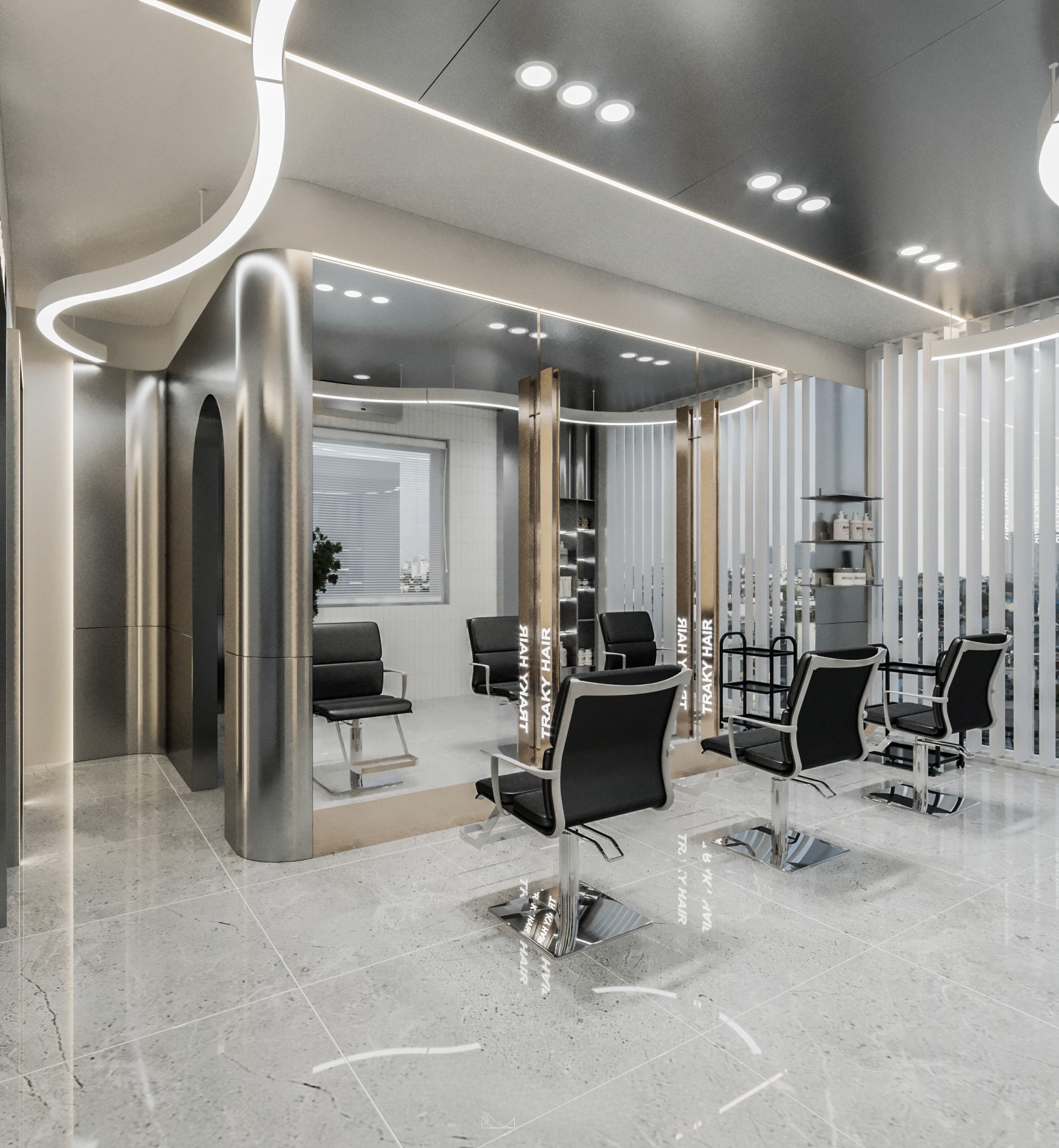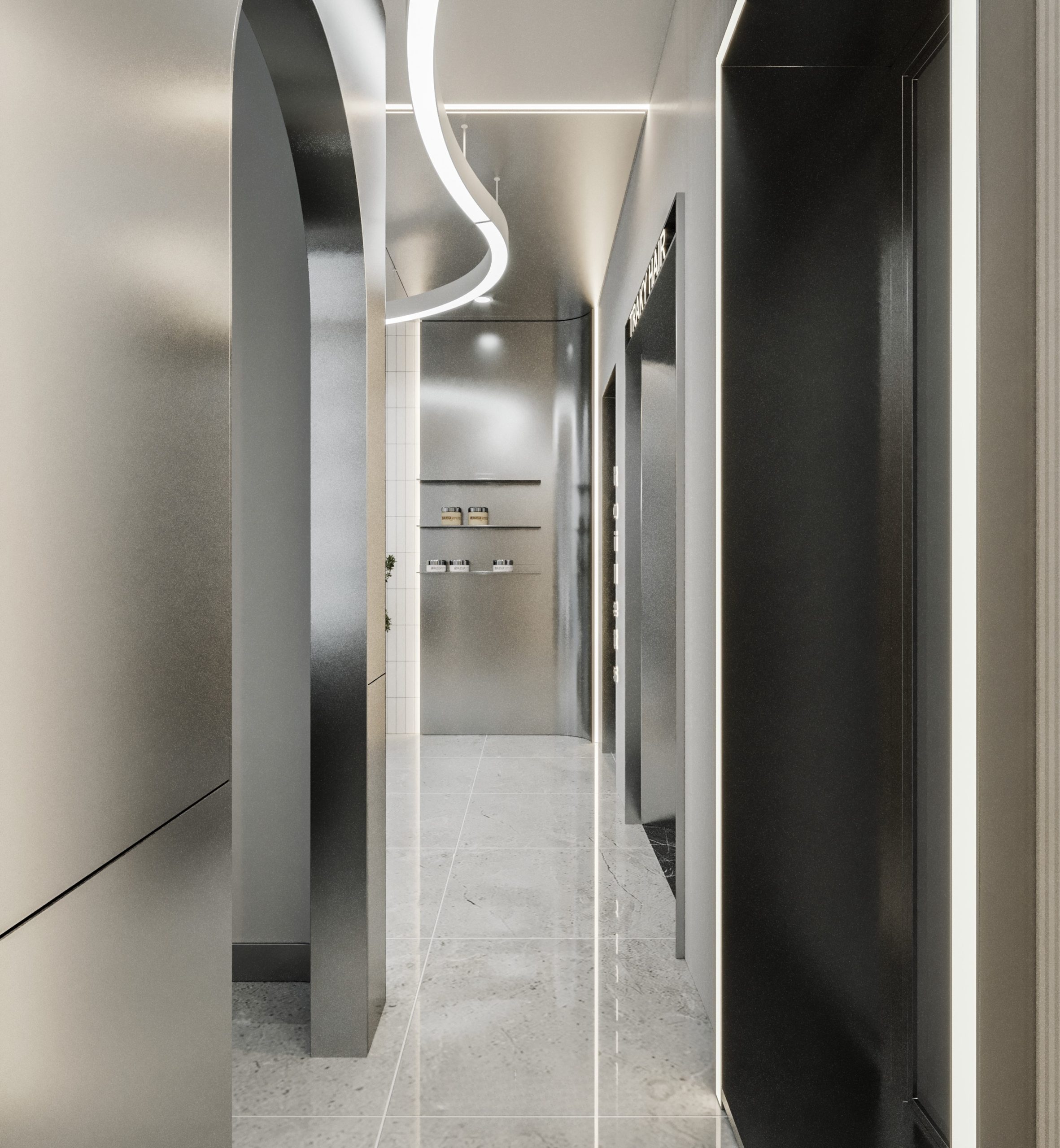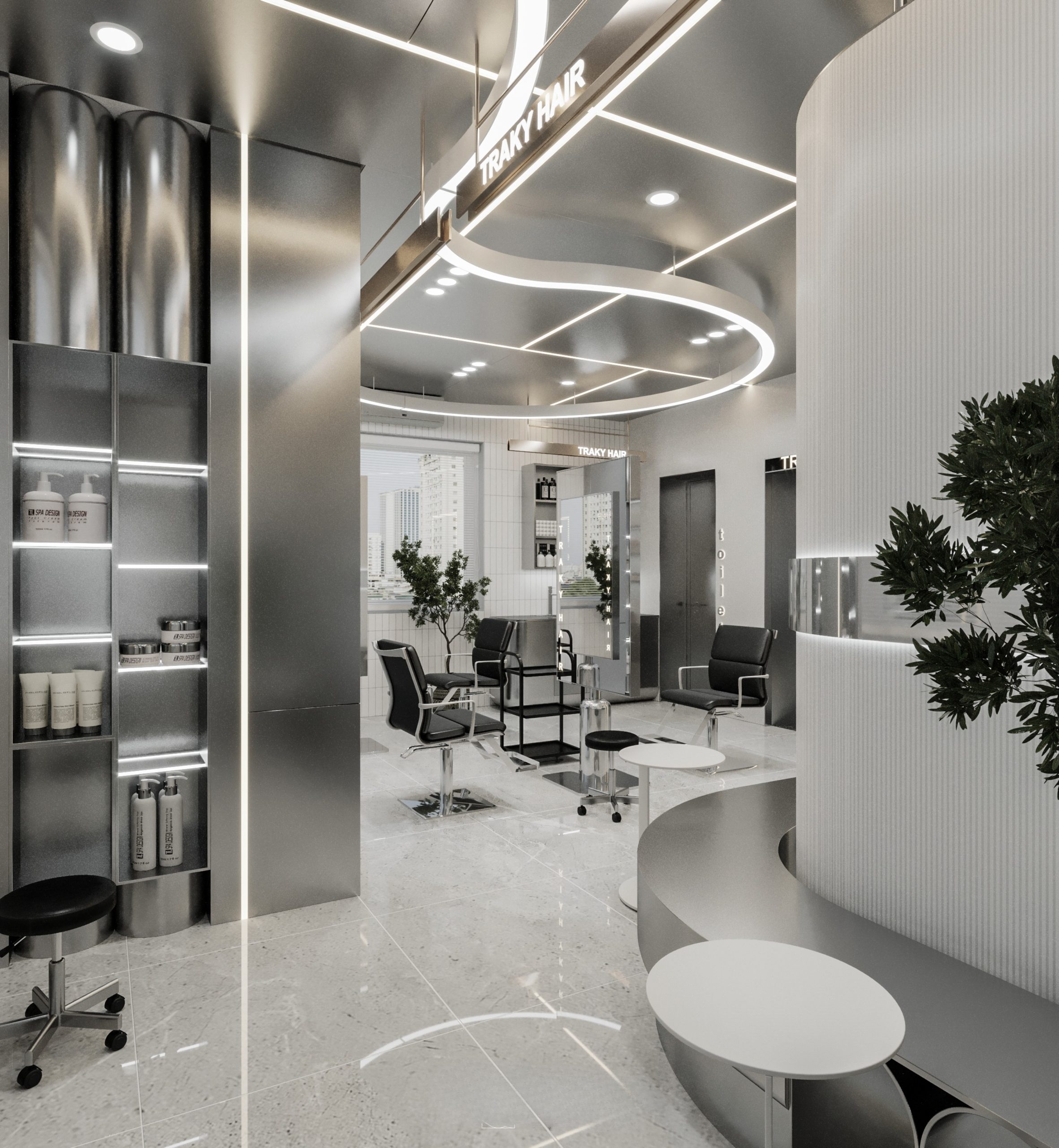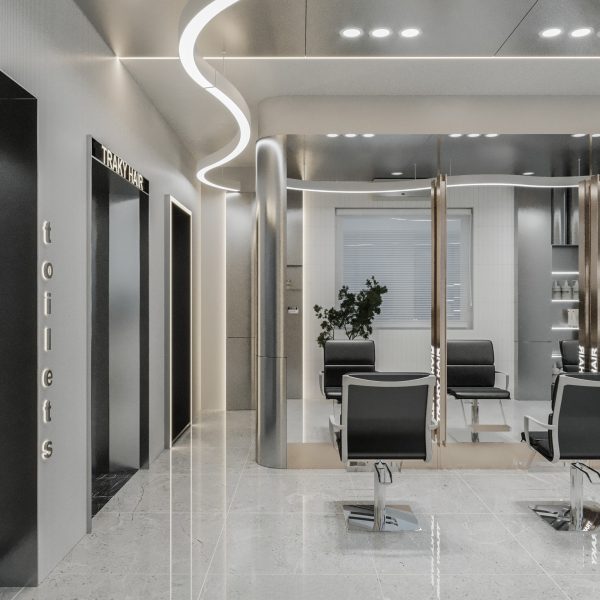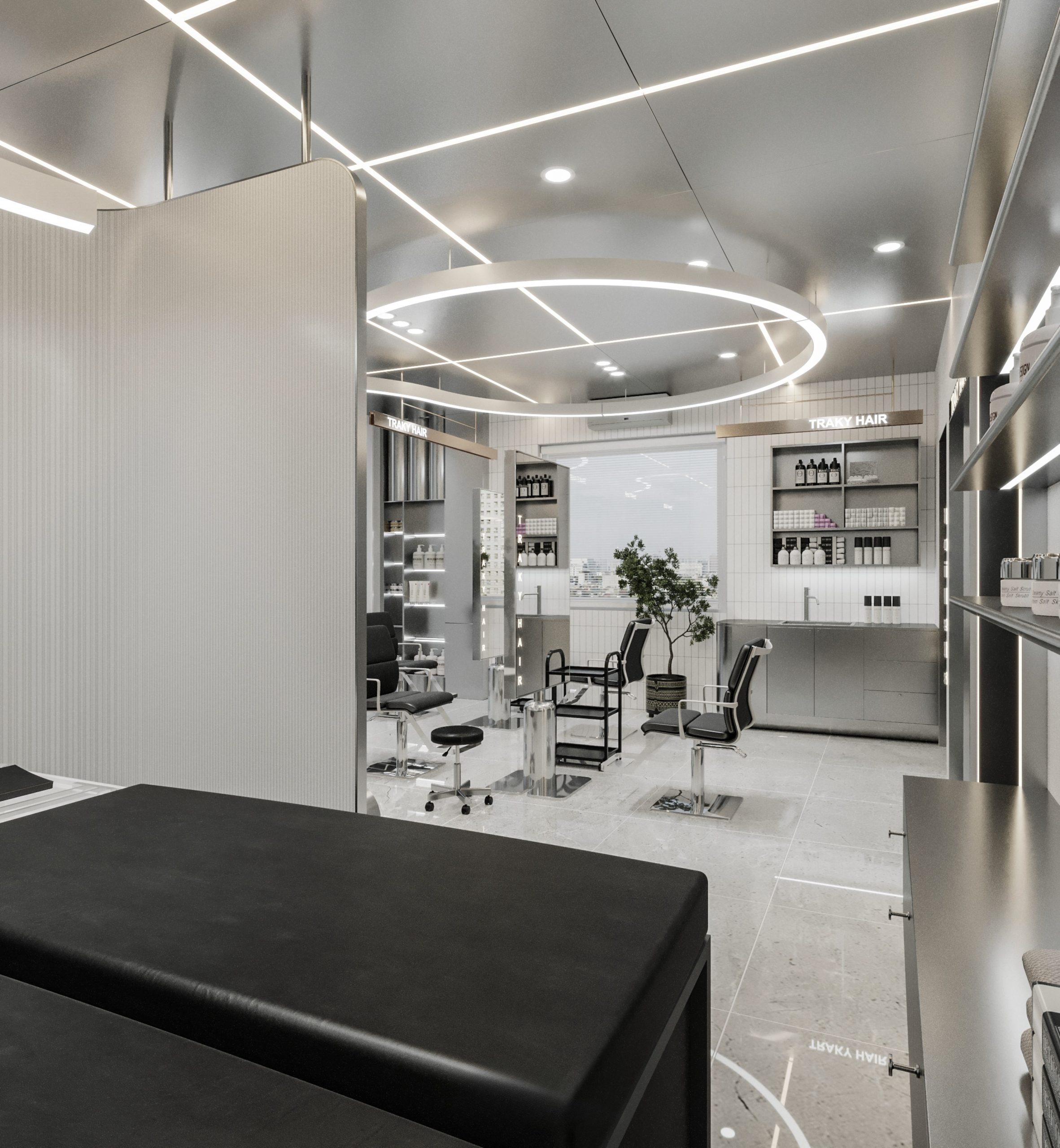 “A space built upon delicate balance, where light and shadow converge to embrace a gentle warmth. The hair zone, the lounge, and the display elements flow seamlessly together, creating a stage for both sight and sensation.”
