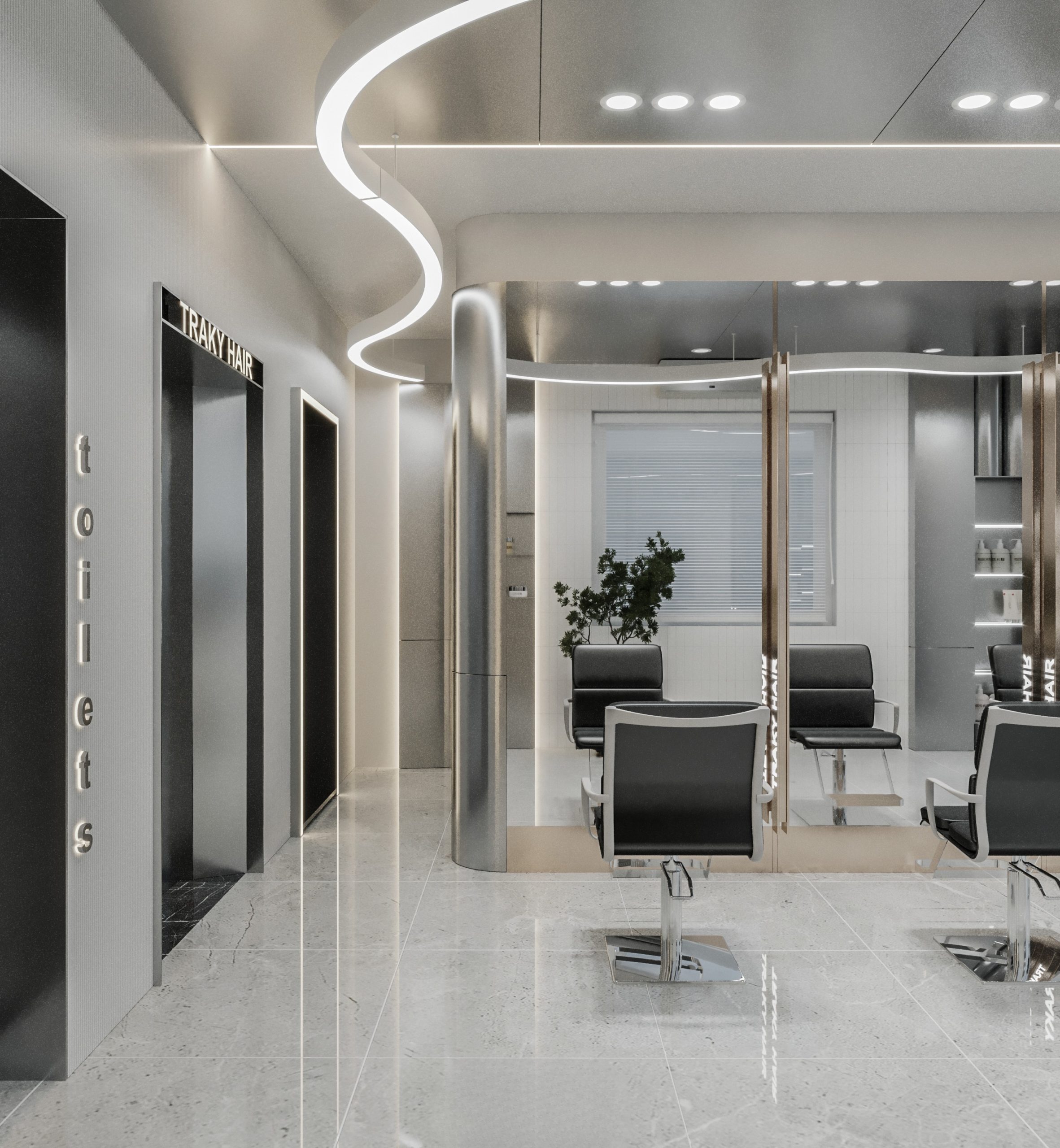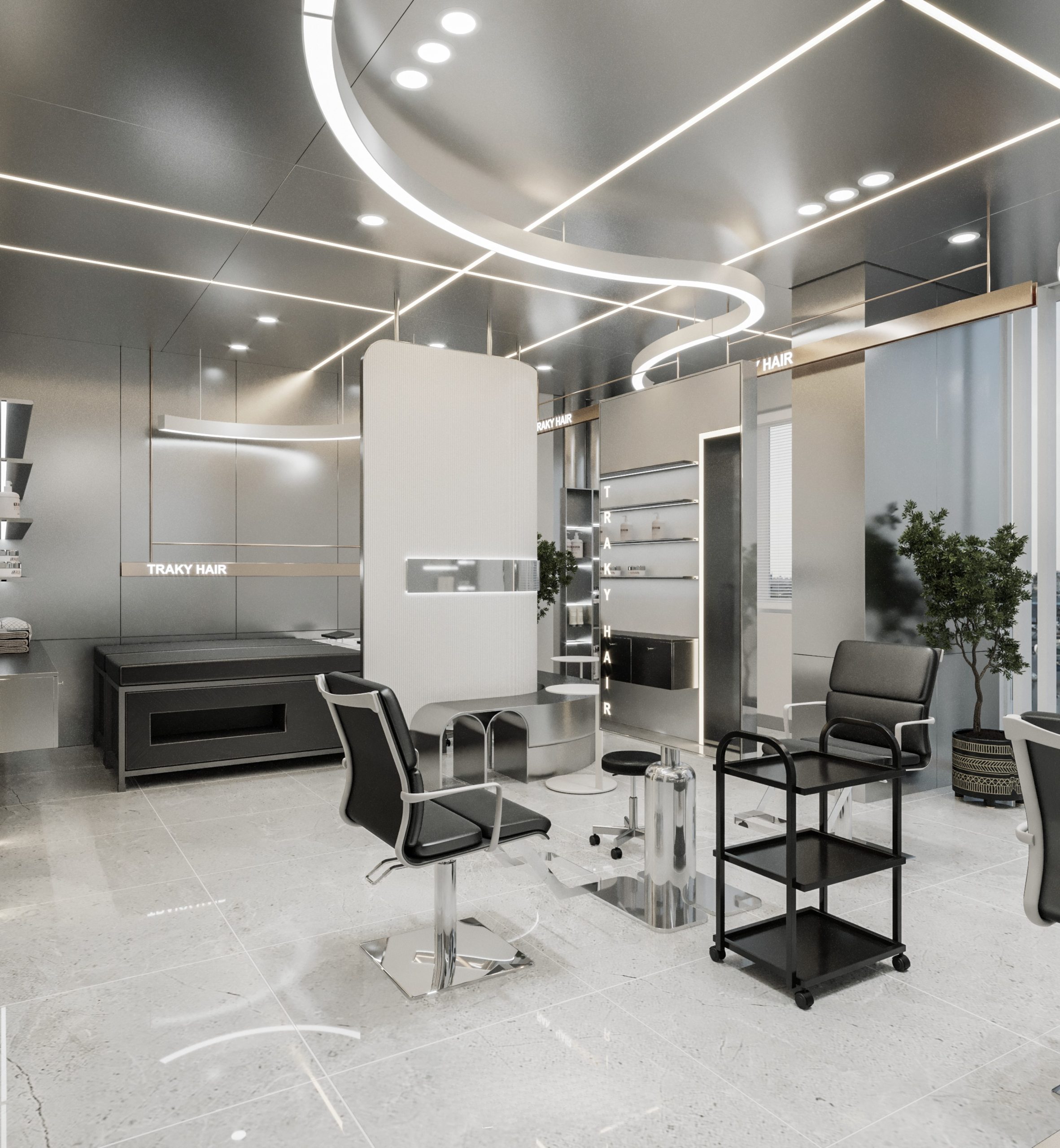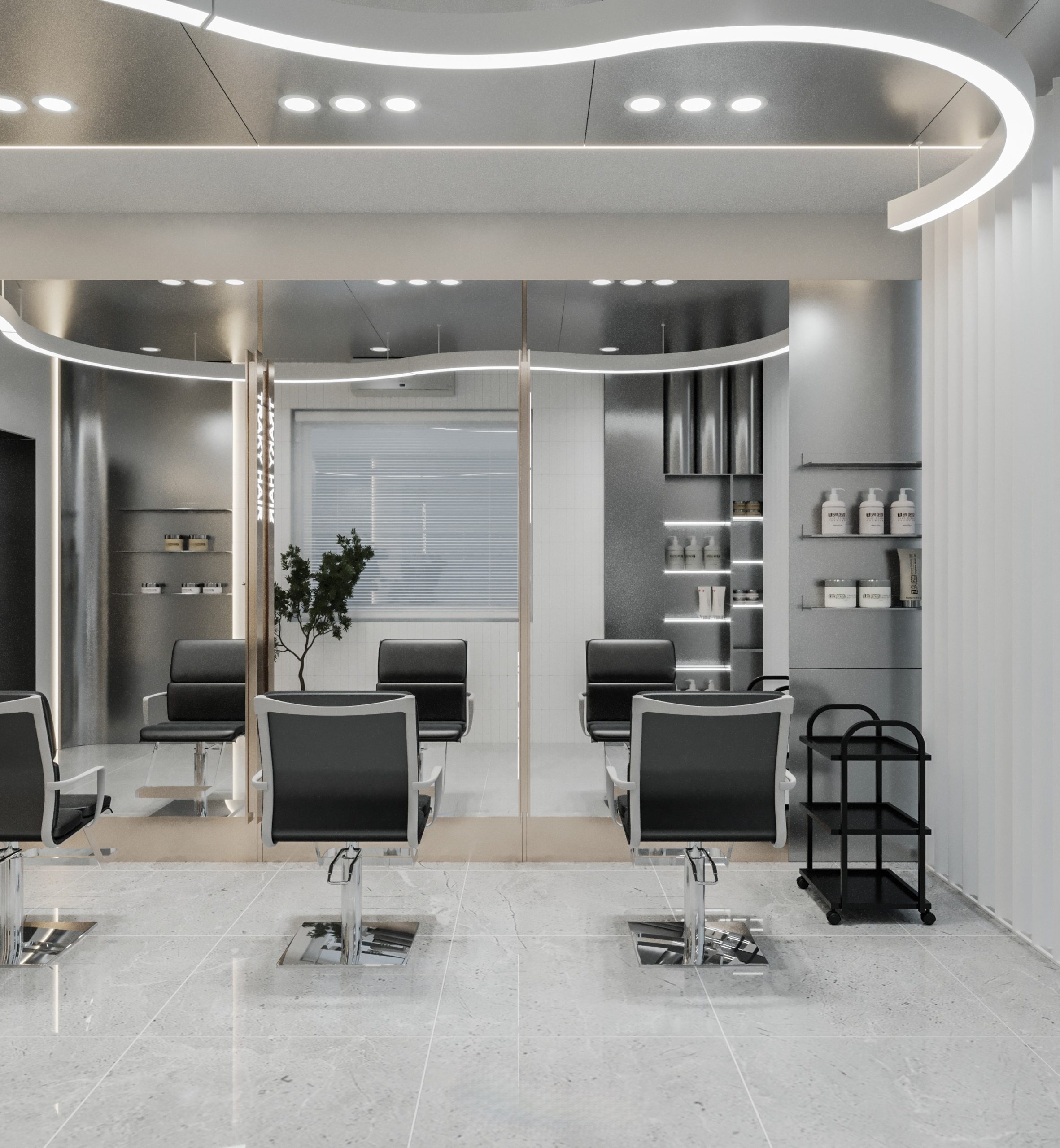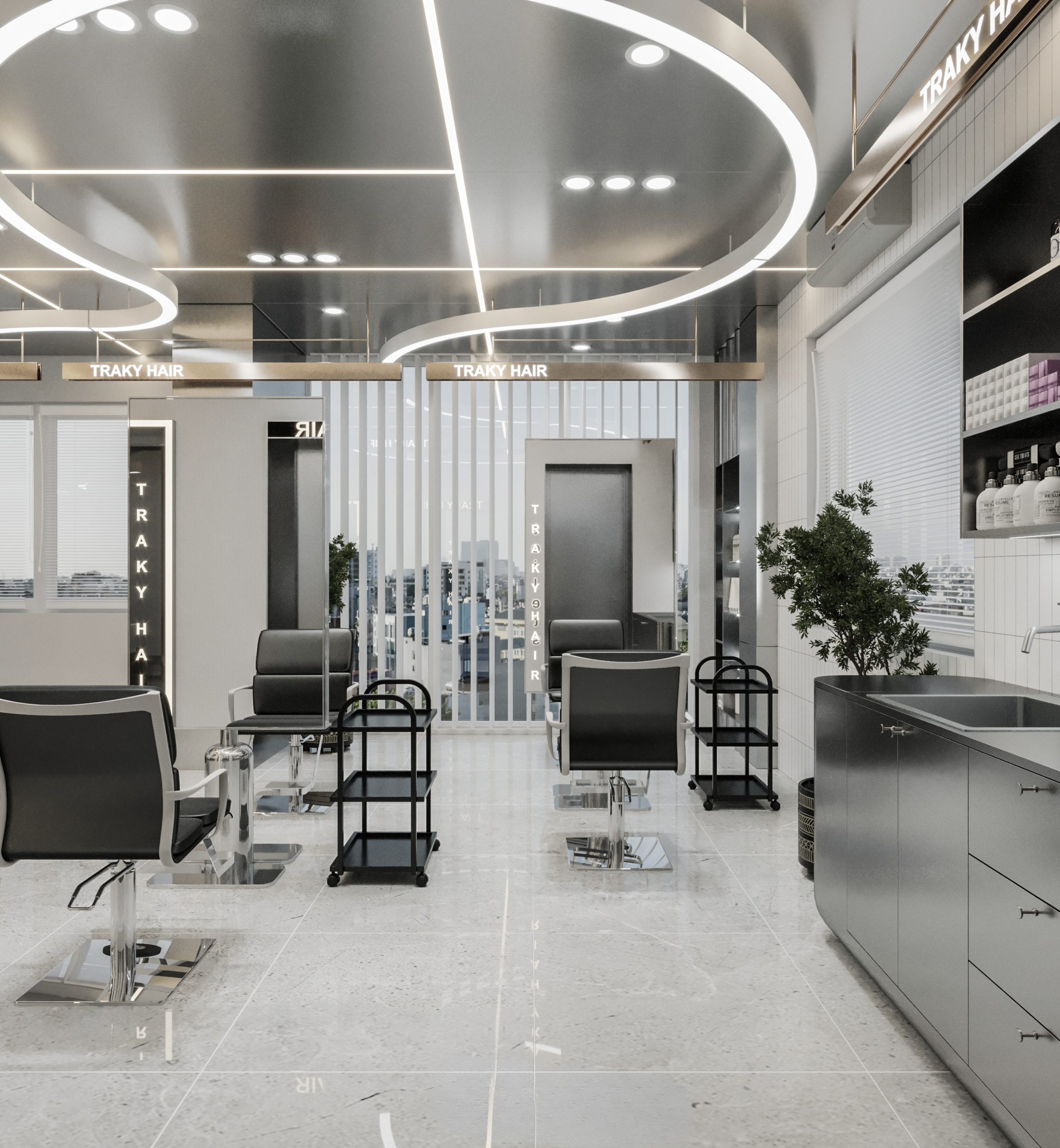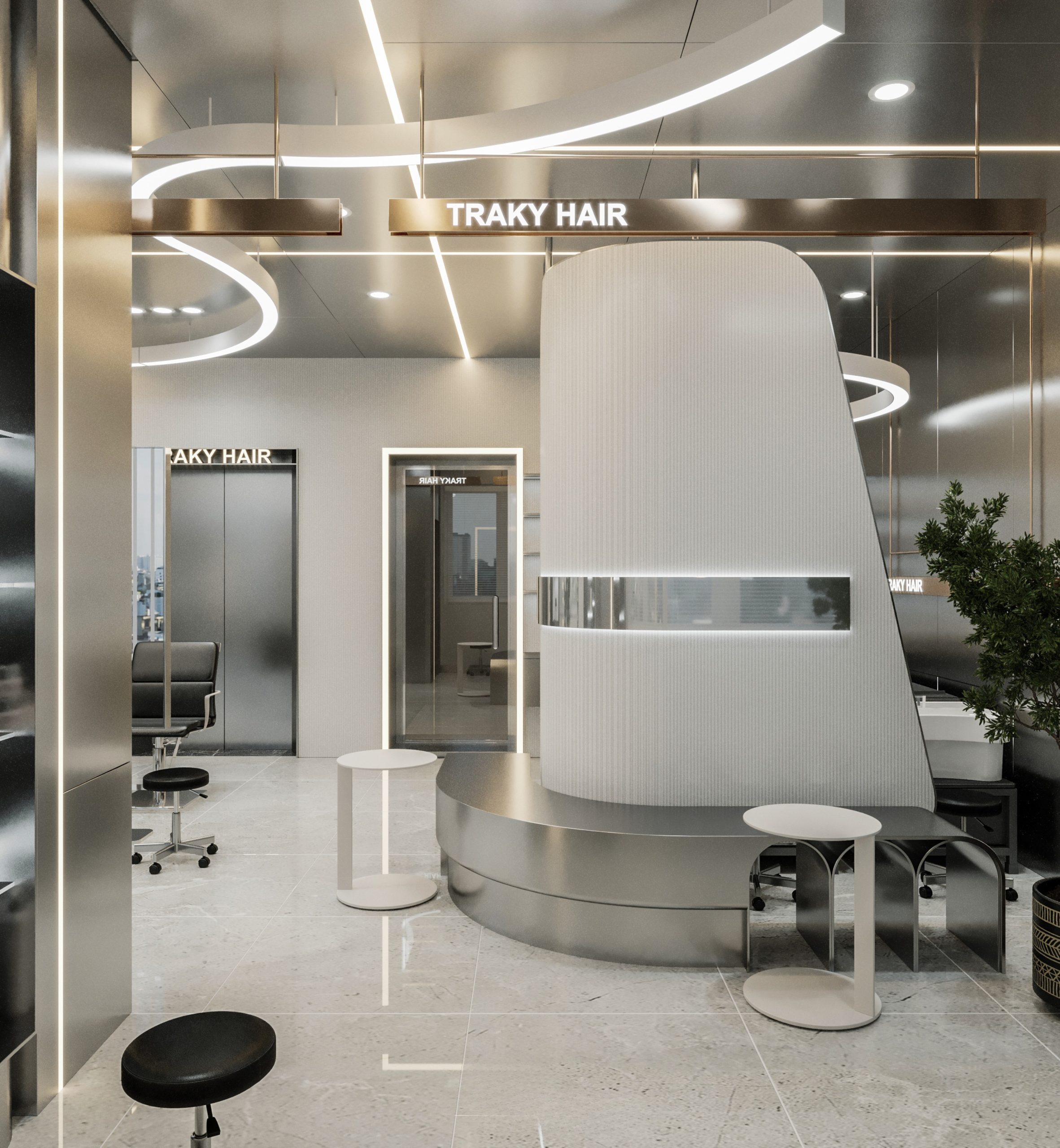 “A space built upon delicate balance, where light and shadow converge to embrace a gentle warmth. The hair zone, the lounge, and the display elements flow seamlessly together, creating a stage for both sight and sensation.”