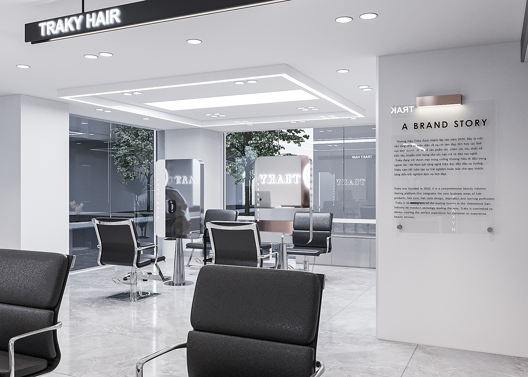 “Không gian được xây dựng trên sự cân bằng tinh tế, nơi ánh sáng và bóng tối hội tụ để ôm lấy sự ấm áp dịu dàng. Khu vực làm tóc, phòng chờ và các yếu tố trưng bày kết nối liền mạch với nhau, tạo nên một sân khấu cho cả thị giác và cảm xúc.”